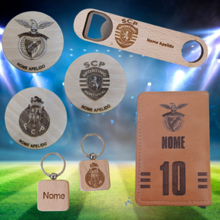 Este pack inclui ainda um abre-caricas e/ou porta-chaves personalizados a combinar com a carteira.